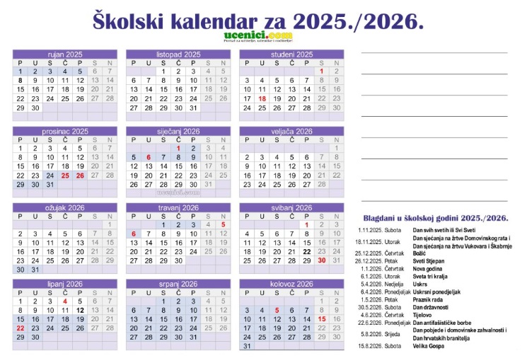 Nastavna godina 2025./2026. počinje 9. rujna 2025. god. i trajat će do 12. lipnja 2026. god.